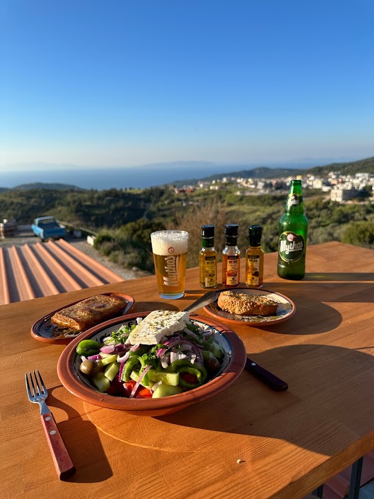 We were here at lunchtime and ordered a Greek salad, pita bread, meatballs, tsatziki and two frappes. It wasn't very busy, which is why we had a seat at the edge of the restaurant with a great view. The service was very nice, the food was delicious and we were given a kind of cold dog for dessert. We also stocked up on homemade olive oil. If we are in Rhodes again, we would love to come back.