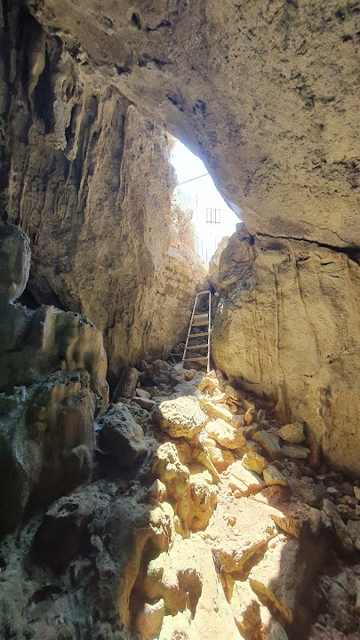 Hard to find, actually forbidden to enter. Be sure to go up, past the fence on the right. The entrance is accessible with an easy-to-open gate and you can enter the cave using an existing aluminum ladder. Take sturdy shoes, sun protection and drinks with you back!! Not for children! The “path” begins on the gravel road across the field/mountain. If you find the blue markings it's a little easier. The hike takes about half an hour. It is a stalactite cave.