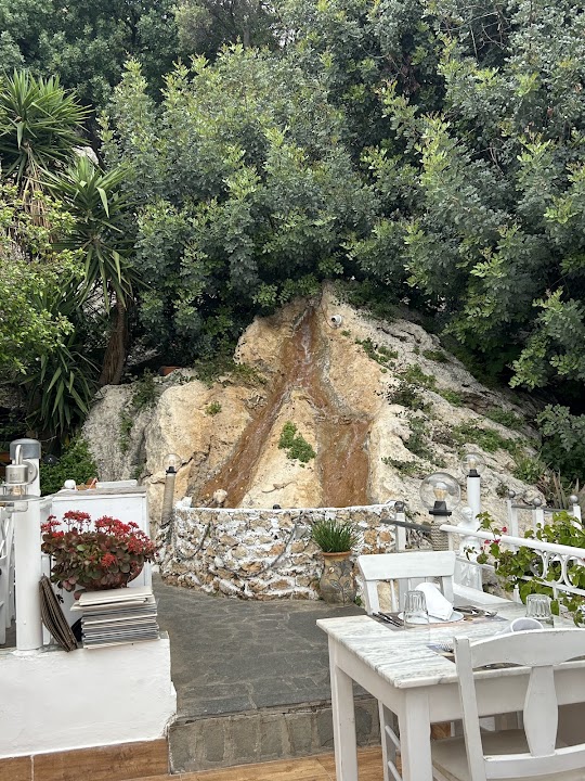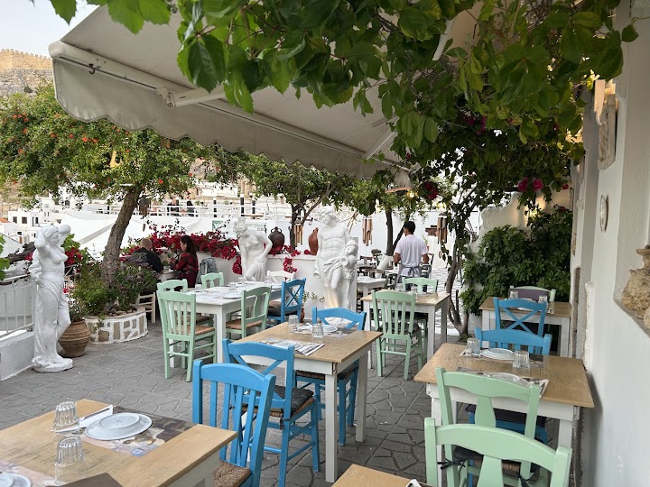The restaurant is in a lovely location with great views of the acropolis and the town. We were sat under a canopy of trees and flowers, and the restaurant as a whole has a nice atmosphere. The food was okay, but not the best we've had in Lindos. Service was friendly and reasonably quick.