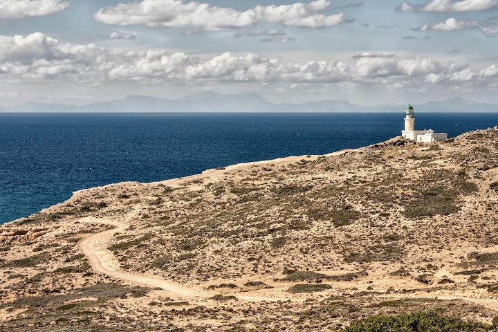 Situated in Prasonisi, 851 09, Greece, the lighthouse stands on what is often referred to as a "small island" or peninsula, connected to the mainland by a sandy spit (which can be submerged depending on the season, creating two distinct beaches). Accessing the lighthouse requires a commitment to a trek: