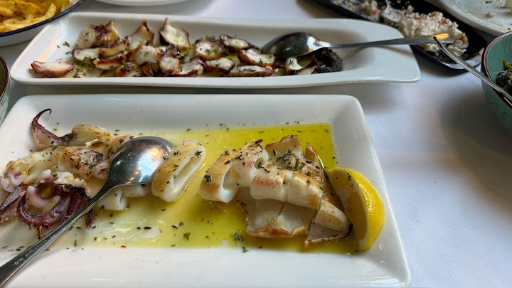 Located in a less busy street. Got there by recommendation from locals.The waitress either did not like something about us or she was having bad time. She was spending effort not to be rude with a fake smile.I checked the reviews later and obviously that is a stereotype.. bad manner, unwelcoming.. bad experience..Rice and meatballs dish was so so, I can cook a better rice dish at home.. scallops were good but there was too much vinegar in the sauce..grilled octopus was the worst ever I had in my life, not edible.. house wine was mediocre but refreshing..and how difficult can it be to warm the bread.. I asked for it and they looked at me with that strange grin , like this has never been done before..The place is known for it’s calamari but the waitress did not even mention about it.as a verdict did not like the food and unwelcoming rude manner of the waitress. Just don’t go there, go somewhere else for at least a normal experience..