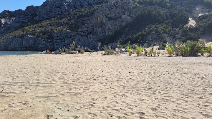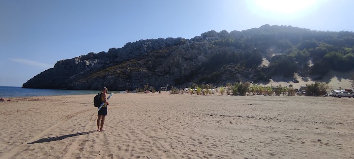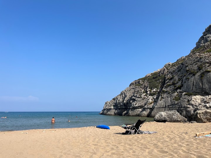 Most beautiful beach in Rhodes. Nudist beach on the south side with a beach hut that offers refreshments and refreshments. Parking 30 meters from the beach.